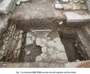Sous la cour de cloître, le mur, fouillé en 2024 et considéré comme antérieur à l’installation des