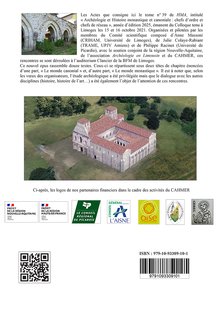 Les Actes que consigne ici le tome n° 39 de HMA, fort de 324 pages, intitulé « Archéologie et Histoire monastique et canoniale : chefs d’ordre et chefs de réseau », année d’édition 2025, émanent du Colloque tenu les 15 et 16 octobre 2021. Ces rencontres ont été organisées et pilotées par les membres du Comité scientifique composé d’Anne Massoni (Criham1, Université de Limoges), de Julie Colaye-Rabiant2 (TRAME3, UPJV Amiens) et de Philippe Racinet (Université de Picardie), avec le soutien conjoint de la région Nouvelle-Aquitaine, de l’association Archéologie en Limousin et du CAHMER4.