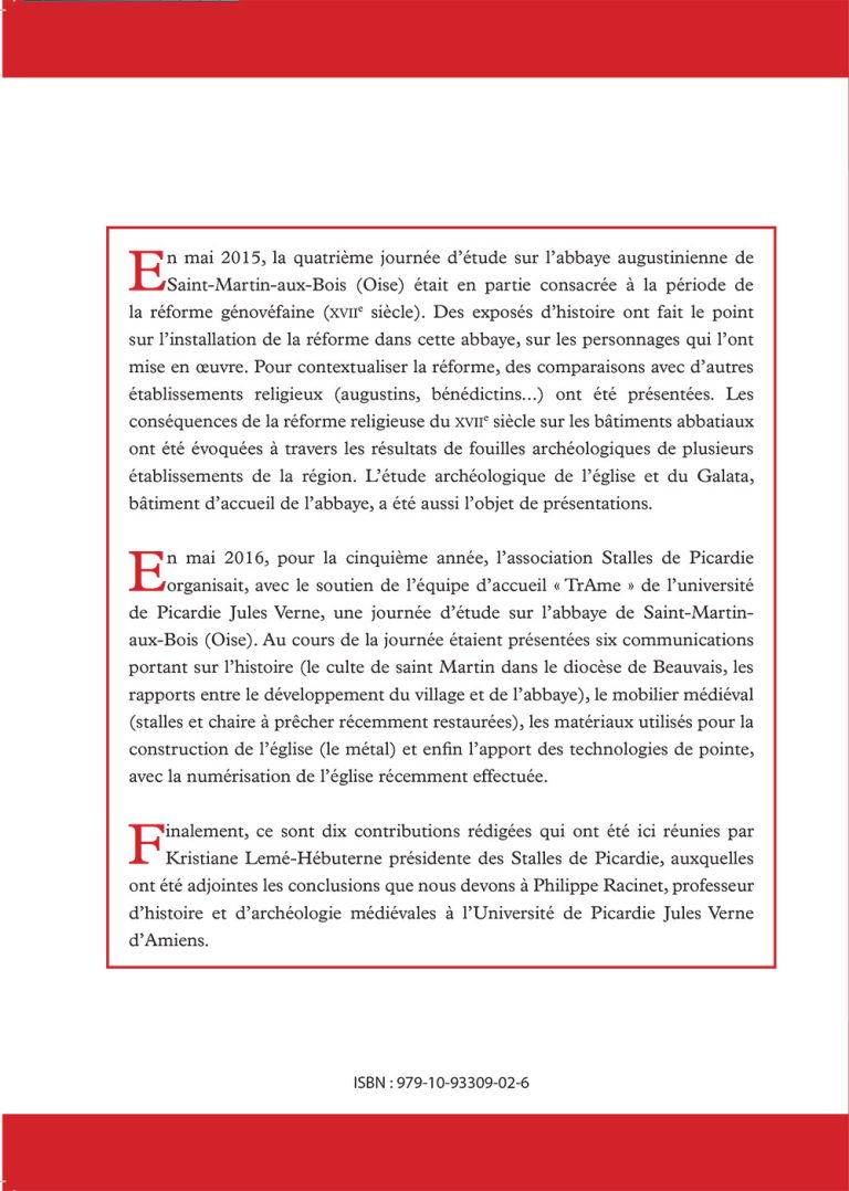 Finalement, ce sont dix contributions rédigées qui ont été ici réunies par Kristiane Lemé-Hébuterne présidente des Stalles de Picardie, auxquelles ont été adjointes les conclusions que nous devons à Philippe Racinet, professeur d’histoire et d’archéologie médiévales à l’Université de Picardie Jules Verne d’Amiens.
